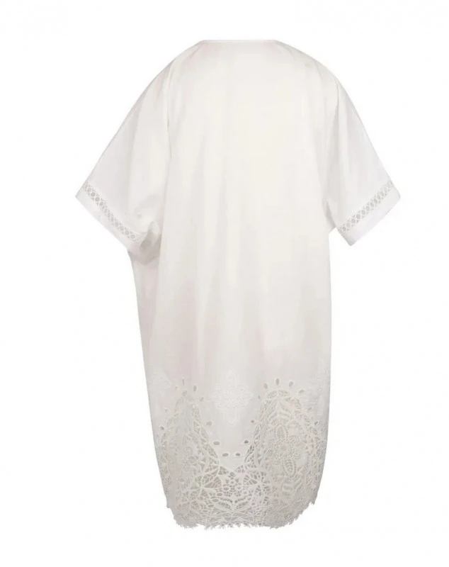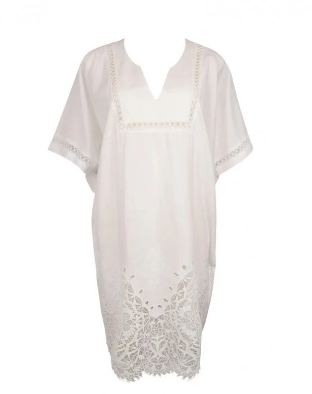 Caftan long Lise Charmel de la collection Odyssée Cashmer vous offre un mélange de confort et d’élégance de par son encolure dégagée accompagnée d’un décolleté et d’une emmanchure soulignés par une belle guipure, ainsi que d’une belle broderie en finition basse.