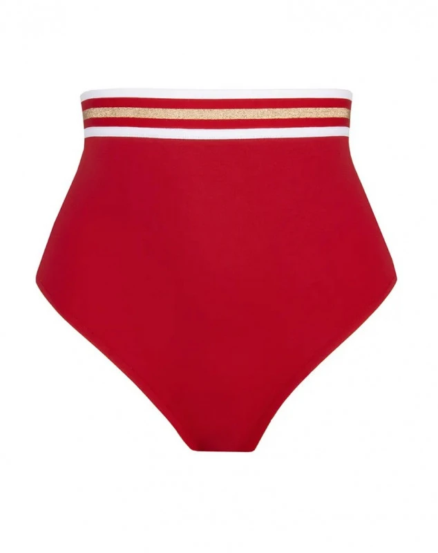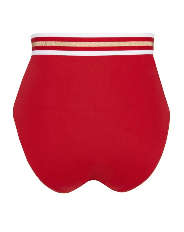 La culotte de bain Lise Charmel de la collection Energie Nautique offre une allure moderne et élégante avec son lastique graphique aux touches cuivrées souligne la taille et sa maille unie tonique certifiée Lycra Sport.