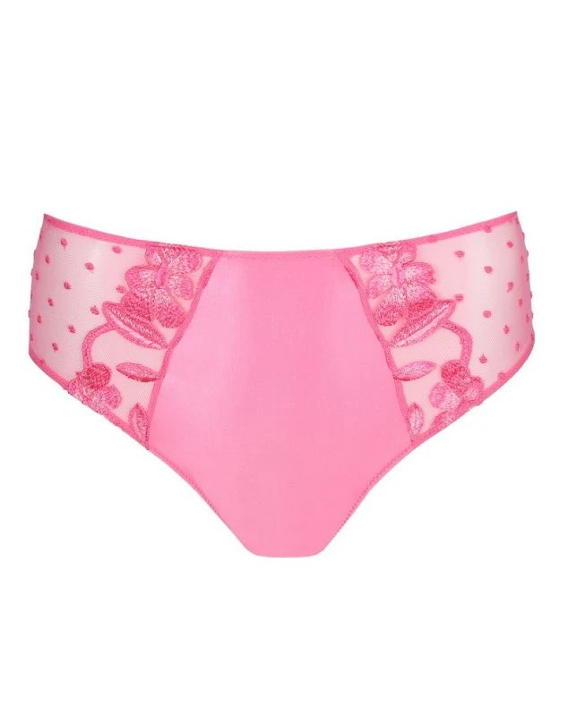 Élégante culotte taille haute affichant un mélange de broderie somptueuse et de tulle à pois.