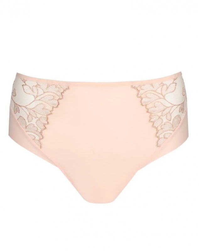 Élégante culotte taille haute affichant une broderie sur les hanches et un triangle de tulle transparent au bas.