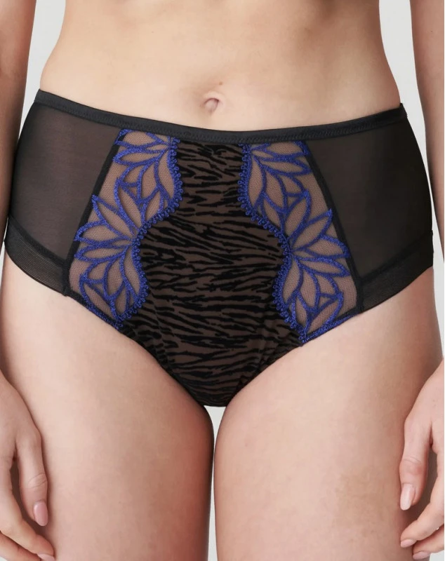 Culotte taille haute élégante affichant un motif floqué délicat et une broderie contrastante. Le tissu est lisse à l’arrière. La culotte a des finitions fines en dentelle graphique au niveau des fesses.
