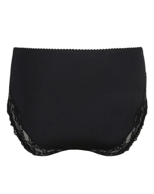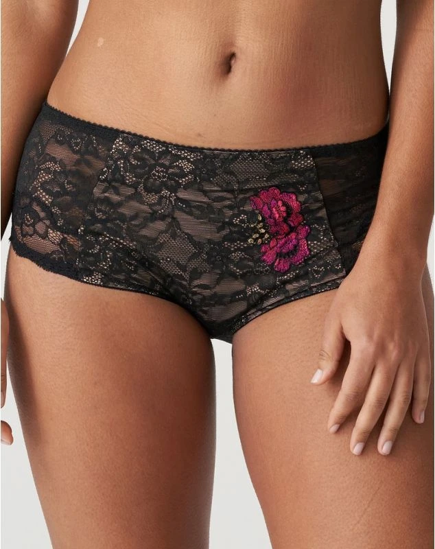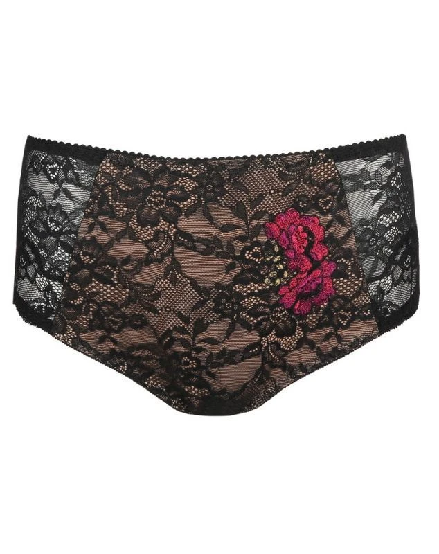 Culotte haute vintage chic en dentelle noire, ornĂ©e d’une rose brodĂ©e chic. SĂ©duisante transparence au niveau des fesses, le devant est doublĂ©. La taille haute enveloppe confortablement votre ventre, la coupe Ă©lĂ©gante de la jambe vous donne une silhouette gracieuse.