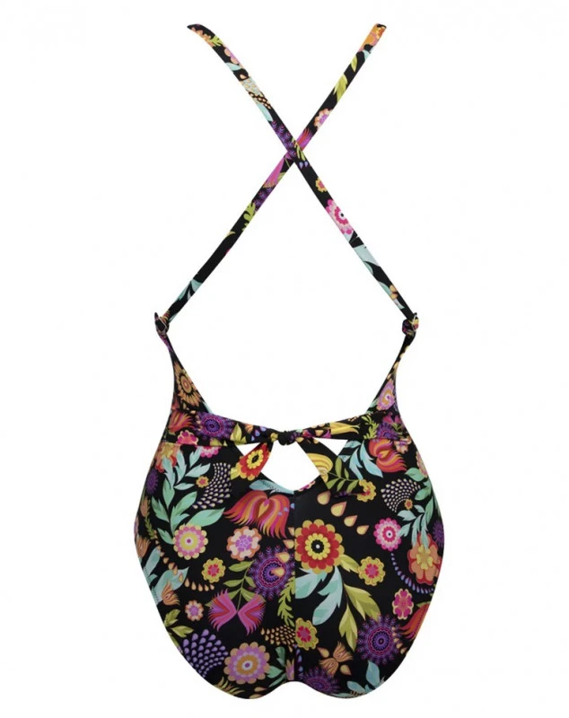 Maillot de bain une pièce de la collection La Muse En Fleurs. Pour un look sexy et chic, ce maillot de bain offre un décolleté en V devant et un dos nu. Il possède un élastique sous la poitrine pour un meilleur maintien. Les bretelles sont croisées dans le dos pour une meilleure tenue. Une fronce avec un nœud dévoile la peau par transparence.