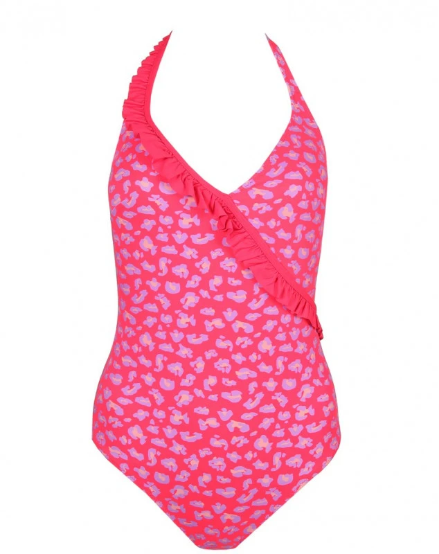 Laissez votre décolleté voler la vedette avec ce maillot 1 pièce rembourré et tour de cou avec finition cache-cœur et volants à l’avant.