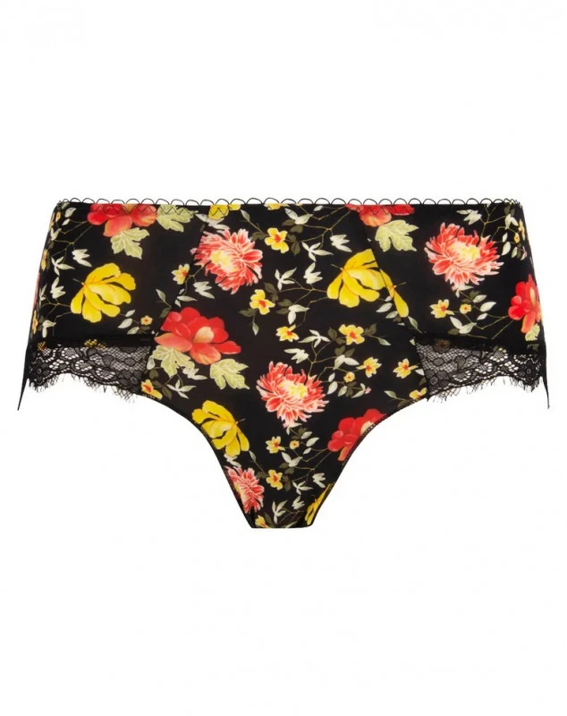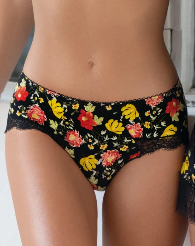 Le shorty Antigel de la collection Jardin des Flirts offre une bordure élastique en polyamide élasthanne fantaisie à ponts, elle souligne délicatement la taille et s’harmonise avec la maille imprimée en inkjet d’un motif fleuri. Le modèle est féminisé par une fine dentelle à barbe contenant de l’élasthanne.
