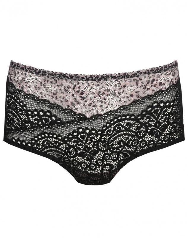 Shorty séduisant en dentelle graphique et à imprimé animalier original. Léger, moderne et cool ! Le shorty a une finition lisse qui ne se voit pas sous les vêtements. Smokey est une couleur noire qui met en valeur l’imprimé léopard.