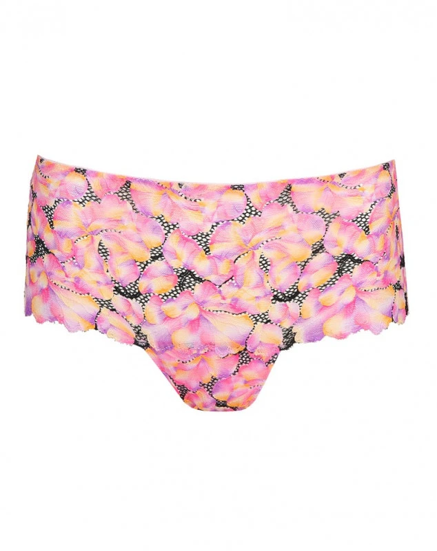 Shorty sexy en dentelle recyclée et imprimée de couleurs : vaporeux et transparent, sans doublure. Peony Pink est le rose doux et intense des pivoines. Féminin et estival !