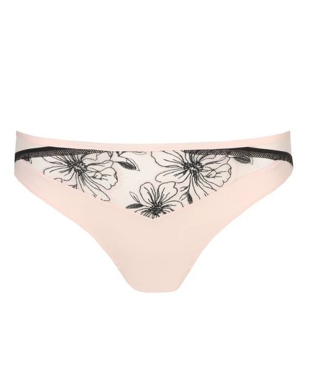 Slip brésilien tendance affichant un imprimé abstrait de fleurs oversize et un tulle transparent. Ce bas est très doux sur la peau, ne se voit pas sous les vêtements et épouse bien la courbure des fesses. Black&Blush est un coloris tendance poudré au look rebelle.