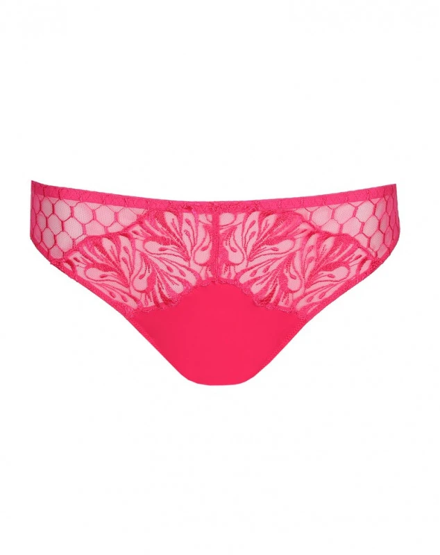 Slip brésilien très sexy en tulle transparent avec un motif de broderie graphique. Electric Pink est une teinte fuchsia puissante et estivale très branchée.