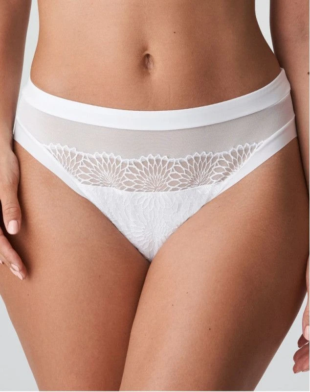 Un slip brésilien orné d’une broderie posée sur du tulle couleur chair. Pour un effet tatouage branché ! Broderie graphique dans un blanc frais : sexy, estival et idéal pour les futures mariées.