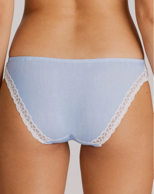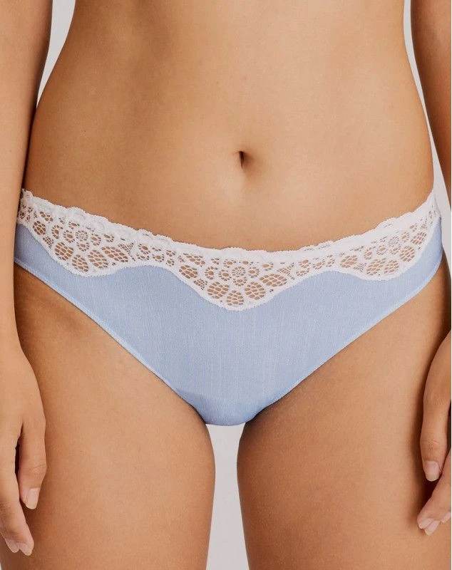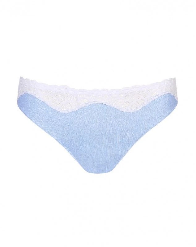 Un slip brésilien tendance en tissu doux à imprimé denim, orné d’une superbe dentelle vintage à la taille. Denim bleu et dentelle blanche : Summer Jeans met les années 1990 à l’honneur.