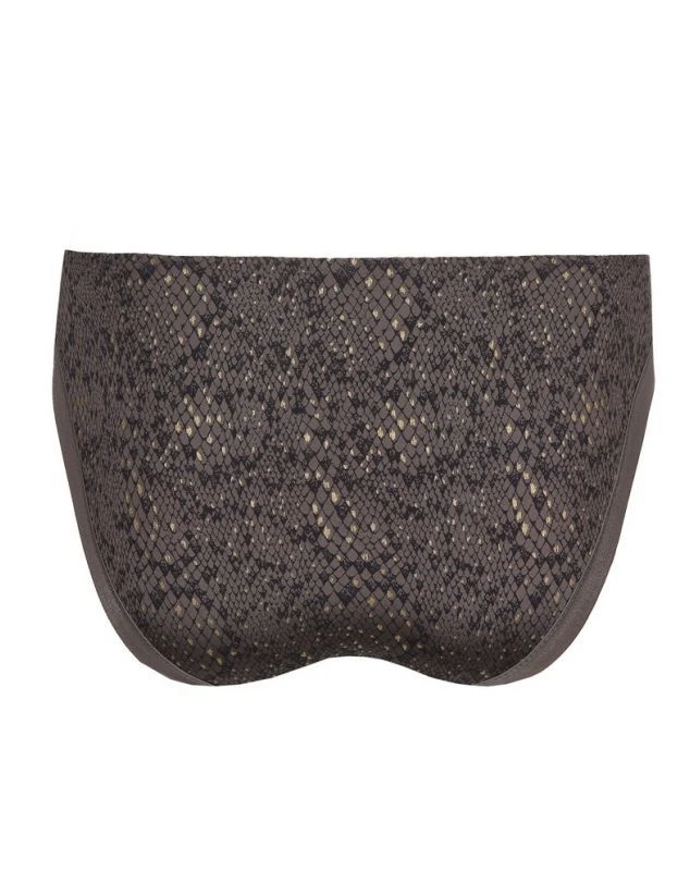 Slip brésilien lisse en tissu satiné brillant à imprimé serpent. Un tulle ludique sur les jambes complète votre look. La coupe échancrée du slip brésilien vous offre une silhouette élégante.