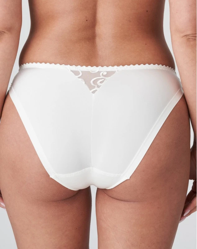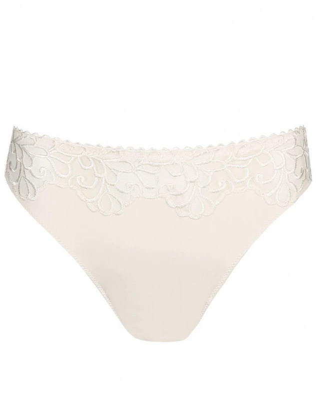 Slip brésilien féminin en tissu imprimé doux affichant des galons de broderie sur le devant. La couleur naturelle féminine contraste délicatement avec votre peau et s’adapte à toutes vos tenues légères d’été. Une élégance pure !