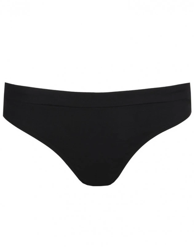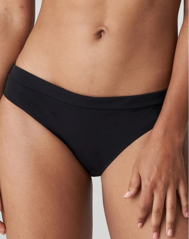 Culotte de bikini à coupe brésilienne et aux lignes sobres, dans une matière unie résistante. La tendance indémodable : des looks épurés en noir intemporel.
