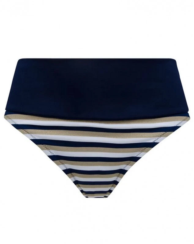 Le slip de bain réversible La Belle à Bord de la marque Antigel est emboîtant dans le dos et large sur les côtés pour un maximum de confort au porter. La maille en lurex est rayée à l’avant et un bleu unis à l’arrière. Pour faire varier la hauteur le slip possède un revers à la taille en maille bleu marine.
