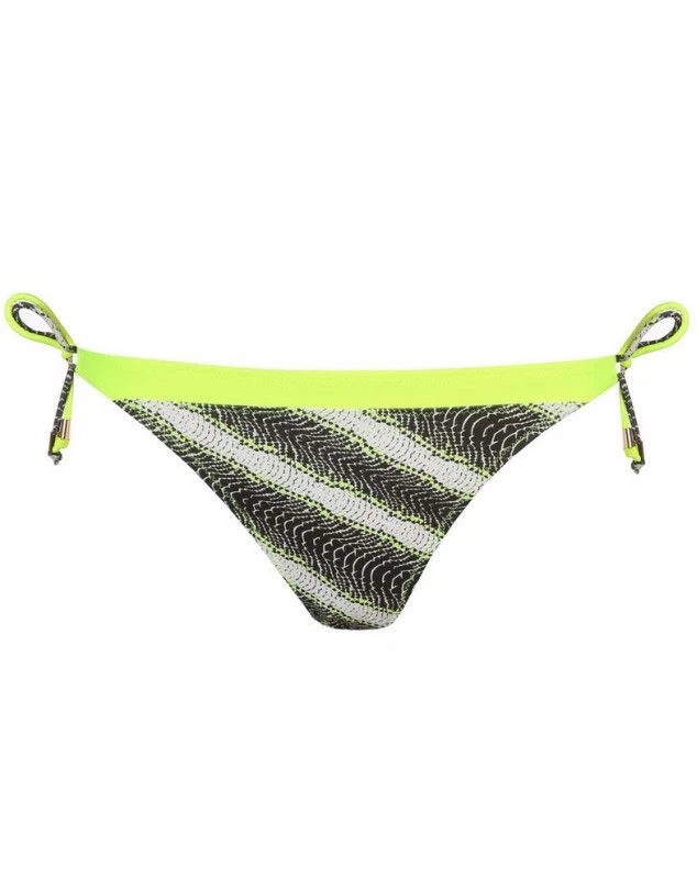 Bas de bikini frivole avec un imprimé rayé très tendance et des accents jaunes fluo. De fines bretelles spaghetti nouées ornent les hanches. Produit avec 79% de fils recyclés. Mélangez un imprimé serpent très tendance, des rayures et du jaune fluo et vous obtiendrez Hello Yellow !
