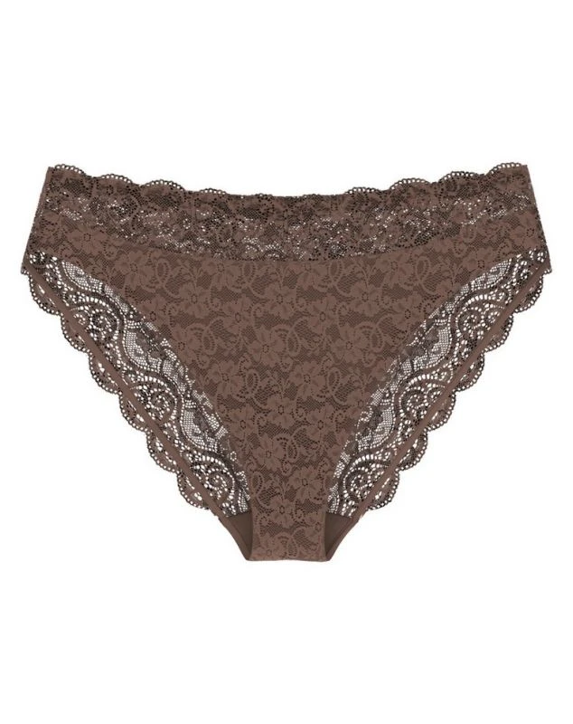 Ce slip échancré Amourette 300, fait tout de dentelle, présente une coupe moderne aux finitions dentelées. Il ne transparaît pas sous les vêtements grâce à ses bordures souples et est transparent grâce à sa doublure en dentelle sur le devant.