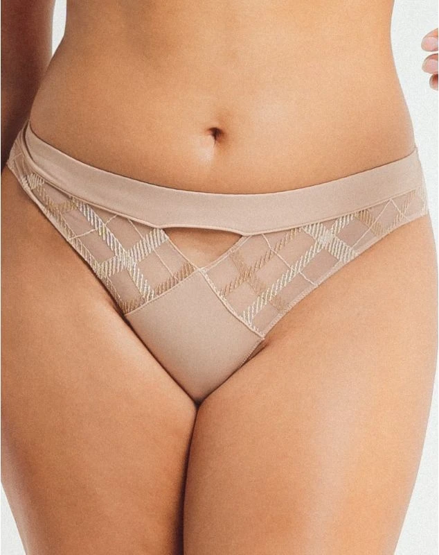 Le slip de la collection Albanach par Louisa Bracq offre une forme sophistiquée avec une légère ouverture sur le devant. Le motif quadrillé est transparent pour un effet ultra séduction, il est accompagné d’une ceinture et un dos unis.