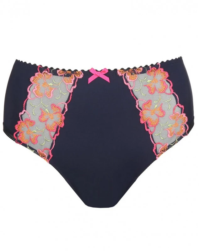 Culotte taille haute luxueuse en tissu opaque, affichant des broderies colorées sur l’empiècement avant et un élastique fin au niveau des fesses. Les couleurs pétillantes de Velvet Blue soulignent votre silhouette d’un bouquet de broderies rose fluo sur une base bleu foncé.