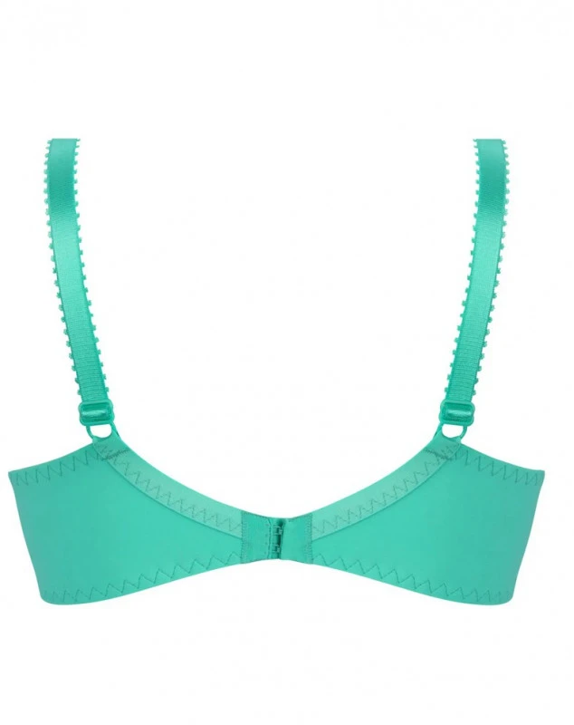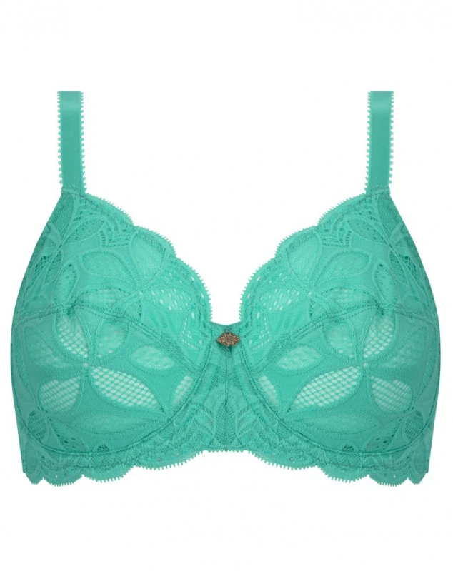 Le soutien-gorge à armatures bien-être Stricto Sensuelle de la marque Antigel, offre une dentelle jacquard composée de polyamide recyclé, conjugué à l’utilisation de fils mats et brillants, créant un subtil relief.