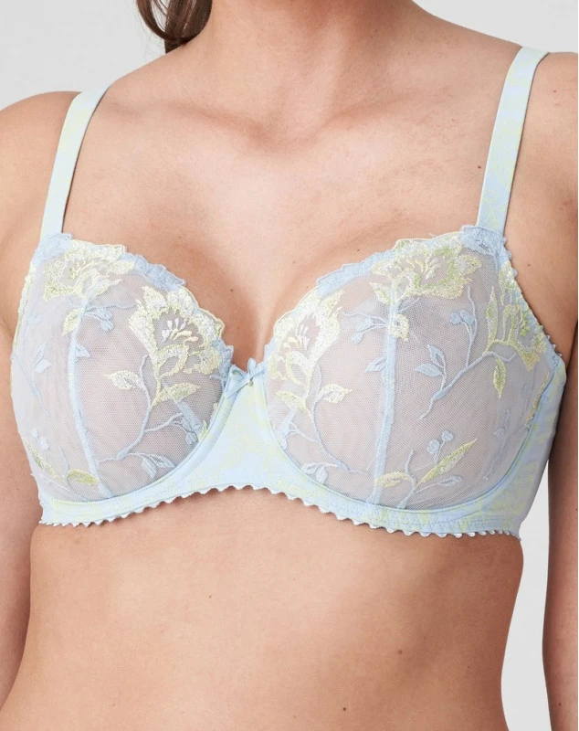 Soutien-gorge balconnet sexy avec tulle transparent et broderie chic sur les bonnets. La bande horizontale en tissu imprimé crée un contraste très tendance. Nuage est un mélange de tons poudrés d’agrumes. À vous le look subtil, féminin et résolument tendance.