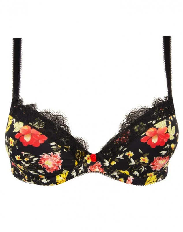 Le soutien-gorge à coques Antigel de la collection Jardin des Flirts offre des coques progressives pour les bonnets A et B ainsi que des coques Light pour les bonnets C et D, avec une maille en polyamide élasthanne douce, légère et tonique, imprimée en inkjet du motif fleuri unique et déjà iconique, propre à cette collection. Les bretelles sont travaillées en continu pour une plus grande liberté de réglage.