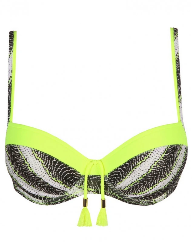 Ce bikini vous fera briller au bord de la piscine ou à la plage. L’ajustement séduisant d’un balconnet mousse est associé à un design élégant et à des détails sophistiqués. La touche de jaune fluo accentue le décolleté. Les bretelles de ce haut de bikini sont constituées de deux rubans fins : un ruban jaune fluo et un ruban à imprimé rayé. Le nœud avec les pompons ajoute une touche d’élégance.