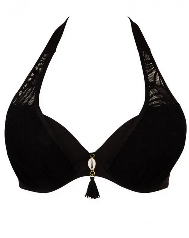 Le soutien-gorge de bain à coque de la collection La Muse Dentelle propose un décolleté plongeant et élégant ainsi qu’une forme de poitrine arrondie. Les coques sèchent rapidement et les bretelles sont multipositions. La dentelle non doublée au décolleté dévoile la peau par transparence. Pour habiller ce maillot, un petit accessoire coquillage et pompon se trouve entre les seins.