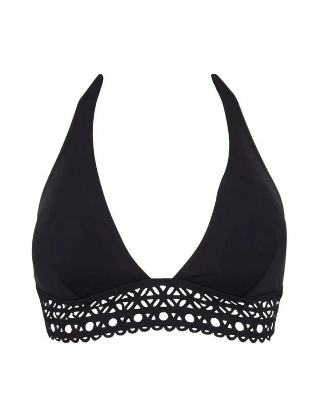 Le soutien-gorge triangle sans armature arbore des coussinets amovibles et une bande ajourée en dentelle élégante sur le devant.