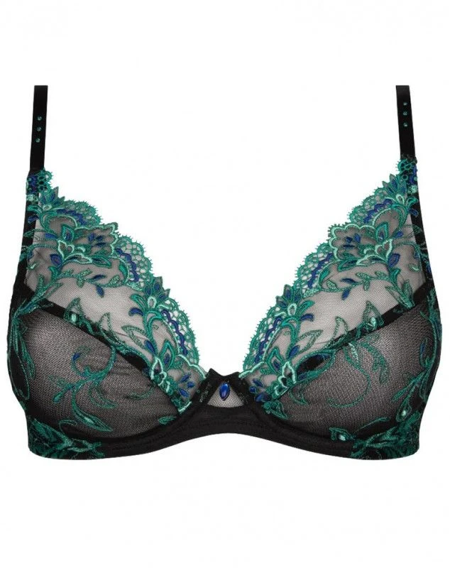 Le soutien-gorge glamour Secrète Emeraude de la marque Lise Charmel offre un décolleté sensuel plongeant doté d’un galbe arrondi. Il met en valeur la poitrine. Egalement orné de sa dentelle Leavers fine et légère, il apporte un confort optimal.