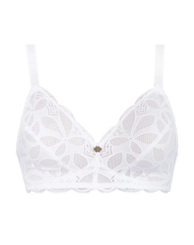 Le soutien-gorge sans armature bien-être Stricto Sensuelle de la marque Antigel a une forme souple et confortable. Ce modèle possède des bonnets et basques en dentelle, un dos en maille, un bijou à l’entregorge et des bretelles fantaisies.