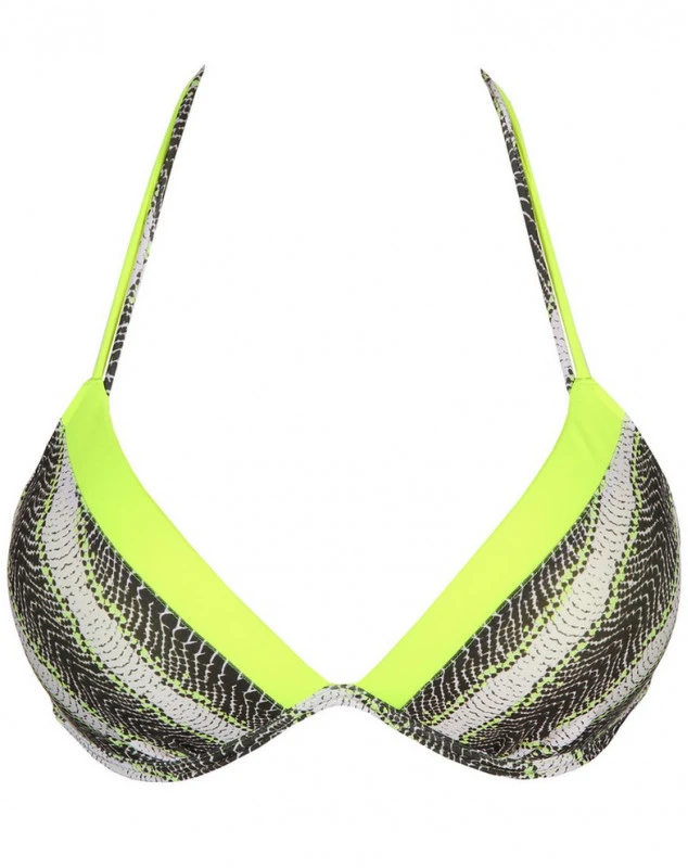 Ce bikini triangle surprend par son léger effet push-up. Le séduisant décolleté est encore accentué par un liseré jaune fluo. Les fines bretelles spaghetti se nouent autour du cou et le bikini a une fermeture dans le dos. Produit avec 37% de fils recyclés.