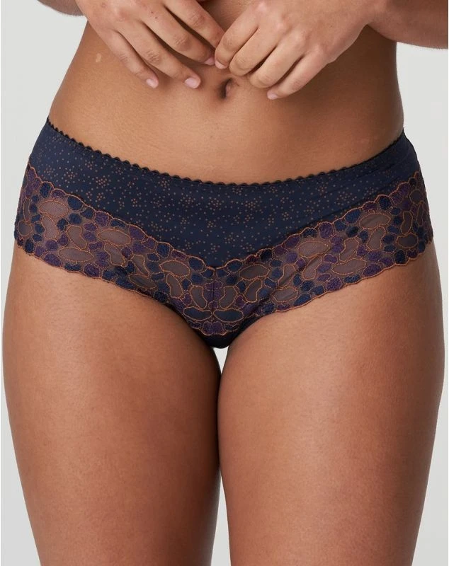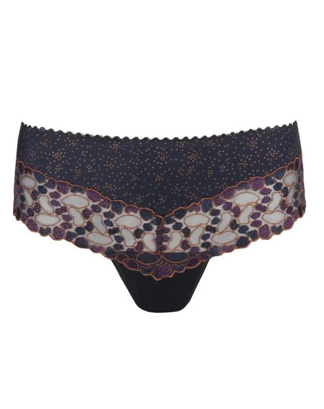 Un string luxueux en tissu imprimé orné à l’avant de bandes de broderie qui se prolongent sur les fesses.