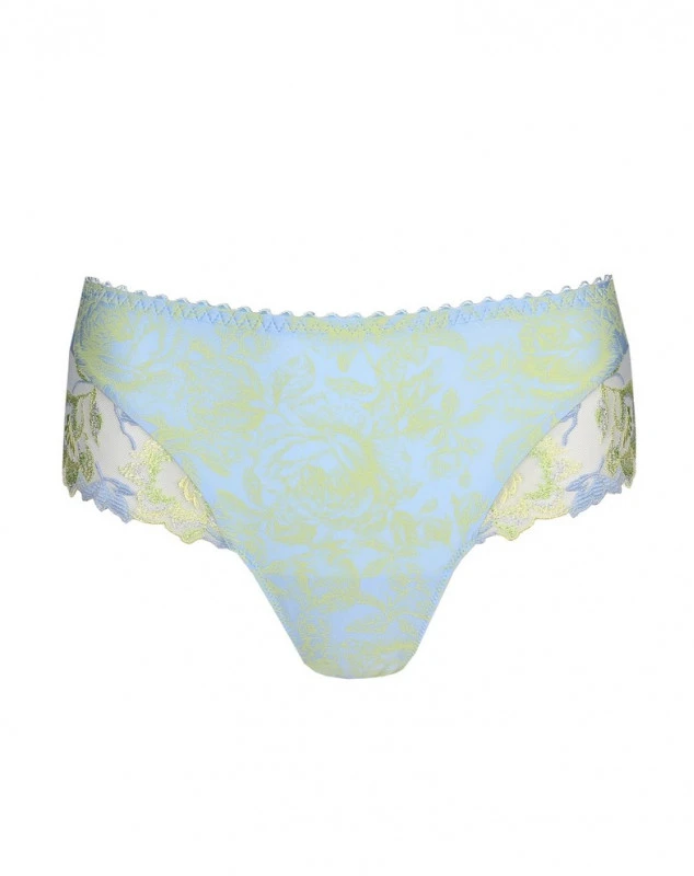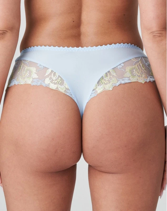 String luxueux et sexy en tissu imprimé doux affichant de larges bandes de broderie au niveau des jambes. Nuage est un mélange de tons poudrés d’agrumes. À vous le look subtil, féminin et résolument tendance.